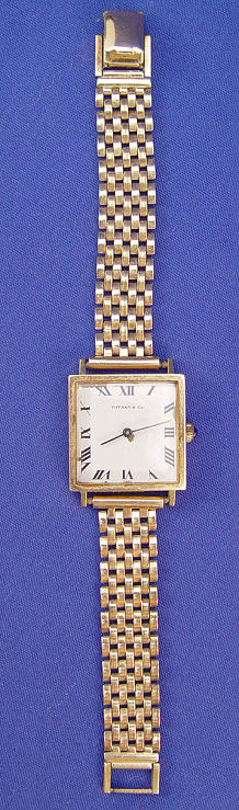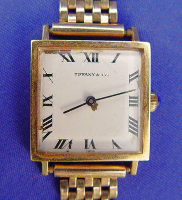 14K GOLD CONCORD WRIST WATCH FOR TIFFANY & CO: Square wrist watch in a 1'' x 1'' unisex size, dial marked Tiffany & Co Swiss, please note peeling enameling to edges and center hole for hands. Works marked Concord Watch Co Swiss 17 Jewel, sapphire? cabochon to stem, case marked inside back Concord Watch Co Swiss 14k 0.585, outer case marked 2035511 and below that lighter mark of 303039. Currently with replacement mesh band of 12k gold fill. Overall 6 3/4''l.