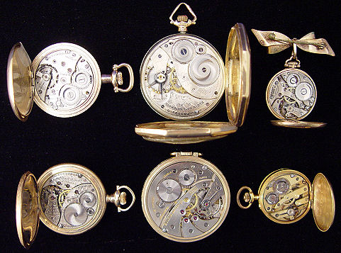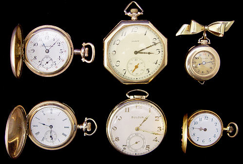 ESTATE LOT OF 6 WATCHES: To include, Elgin 14k gold open face, model 2 size 14?, serial #26113350, octagonal case marked Roy 14k585/1000Fine, currently keeping time, slight bend to metal around dial not seen when watch closed, crystal loose on one side. Bulova open face gold filled, 15 jewel Swiss made movement, case serial # 9184980. Currently keeping time. Lady's Elgin hunt case, gold filled simple wheel etched pattern, internal door monogrammed KK, Fahys case serial #7488418, works serial #11410808. Not currently keeping time. Lady's Hemerton hunt case, 15 jewel Swiss made works, gold filled case by Girard Watch Co in a simple wheel etched pattern, serial #2567837. Not currently keeping time. Lady's 18k gold hunt case set with white and red stones to front cover, overall as is condition, cracked dial, missing crystal, ticks but missing hand, monogrammed to back Hubbie to MS. Lady's gold filled lapel pin watch by Montauk, 15 jewel Swiss made works, not currently keeping time. Six watches sold as a