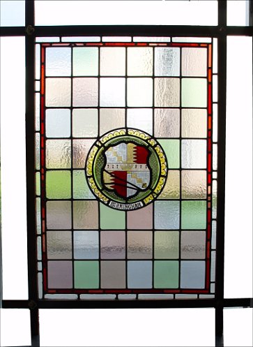 HERALDIC BIRMINGHAM ENGLAND STAINED GLASS WINDOW: Centering the coat of arms and ''Birmingham''. In wooden frame. Only crack is in the shield. Approx. 41 1/4'' x 29 1/4''.