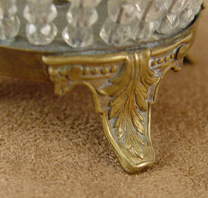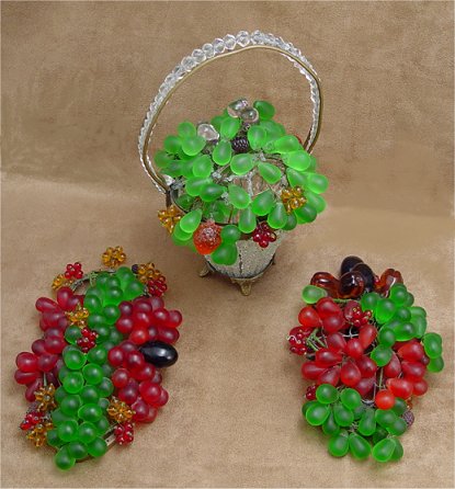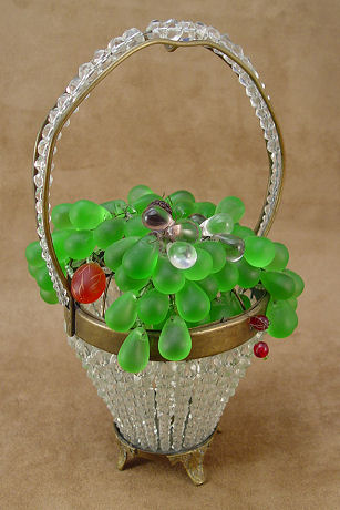 ART DECO CZECHOSLOVAKIAN GLASS FRUIT LAMP: Clear glass beaded basket filled with glass fruit. 11''h. x 6 1/4''w. Lacking the electric component. Sold with extra fruit, formerly from lamps, for replacement pieces. Impressed Czechoslovakia on the underside.