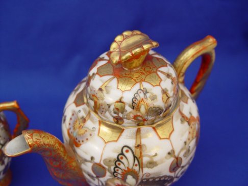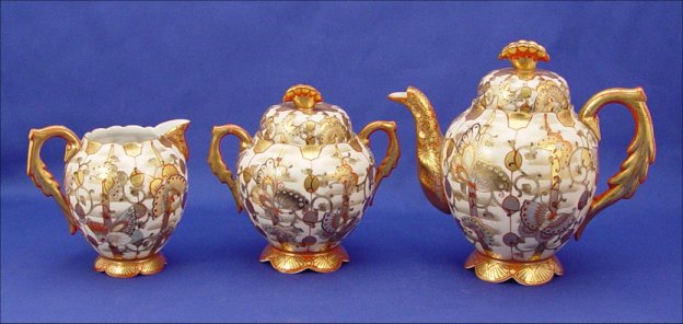 FINE HAND PAINTED JAPANESE SATSUMA TEA SET: Comprising teapots, sugar, and cream pitcher. Signed in red characters, pot is 7''.