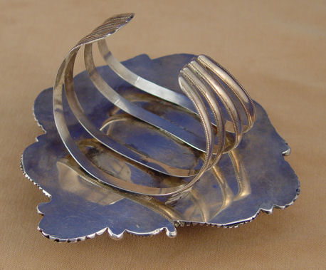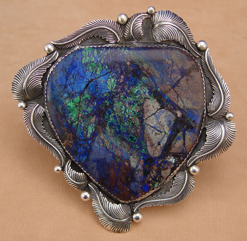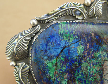 PEACOCK AZURITE & SILVER ARM BAND: Tremendous piece of workmanship featuring a triangular shaped azurite with lovely color variation, front measures approx. 5 1/4'' x 5'', cuff opening now 3 1/4'' x 2 1/8'', no mark found.