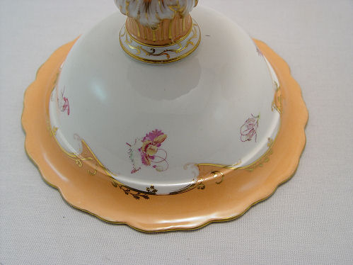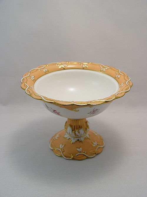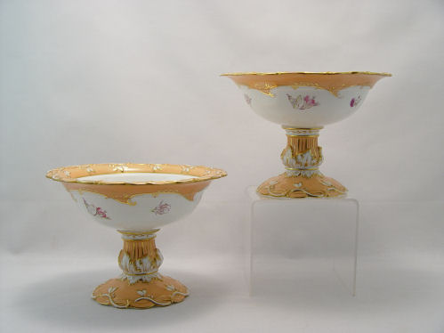 PAIR OF EARLY ENGLISH PORCELAIN DESSERT COMPOTES: Ca. 1855. Hand painted floral and gilt decoration. The base has raised acanthus leaves, a form used in the finer china houses of England. 5''h, 7'' dia. Please call for condition.