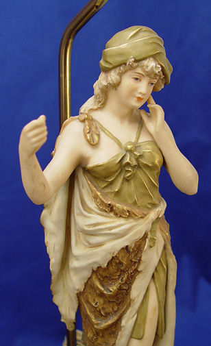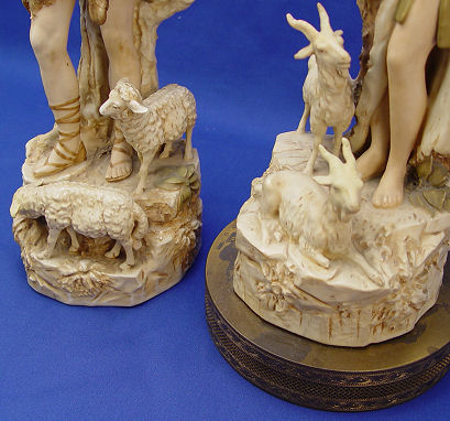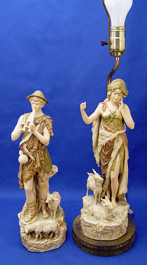 PAIR OF ROYAL DUX FIGURES MOUNTED AS LAMPS: Shepherd and shepherdess, the boy with sheep, the woman with goats. Iridised finish on the clothing. Each of the porcelain figures are 15''h., removable from lamp base. Est. $300/500**