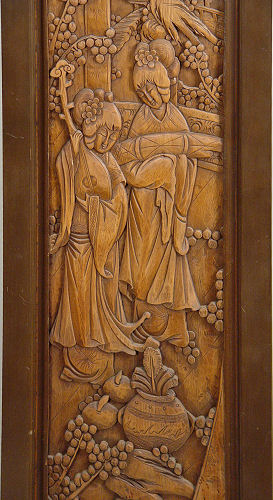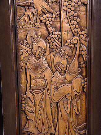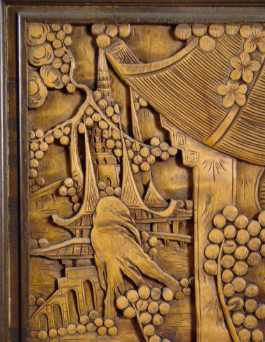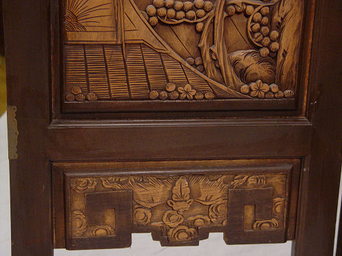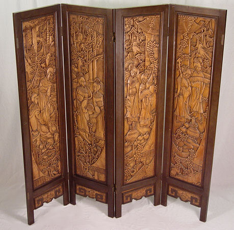 JAPANESE CARVED TEAK 4 PANEL SCREEN: Each of the panels has highly detailed carvings of Geisha in lush scenic landscapes. Approx. 71''h. x 75''w.