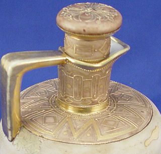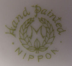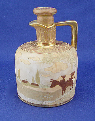 NIPPON SCENIC HAND PAINTED DECANTER: Decorated in landscape scene with cow, heavy gold accents. 6'' h., green, Morimura Bros. mark. Porcelain is in fine condition, the cork is partial.