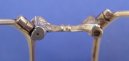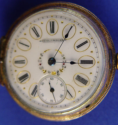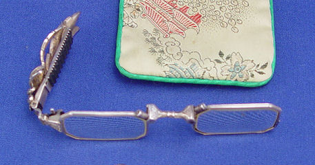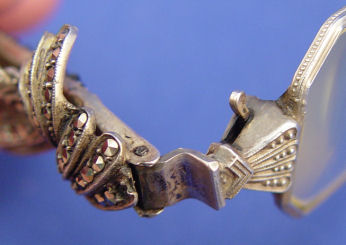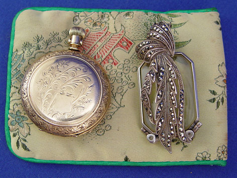 TWO PIECE LOT - POCKET WATCH & LORGNETTE: Columbus pocket watch in gold filled hunt case, case serial #1488487, works serial #280723, circa 1895, not currently keeping time, partial separation of crystal from case. Lovely etched case, no monogram. Silver metal and marcasite folding lorgnette, marked 835, missing 5 marcasites, open measurements 4'' plus 2 1/2'' feather motif handle, folds into 2 1/2'' x 1'' x 1/2'' package. Est. $200/300**