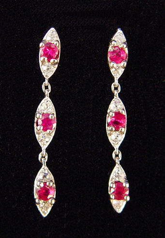 PLATINUM, RUBY & DIAMOND DROP EARRINGS: Delicate three tier drops each level set with a ruby and two diamonds, platinum (assayed), approx. 1 3/8'', 3 grams.