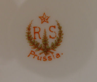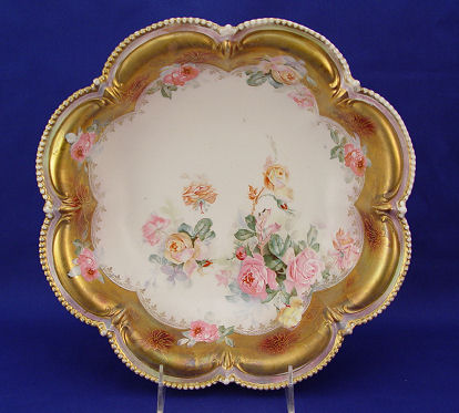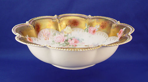 SIGNED RS PRUSSIA BOWL ROSE DECORATED PORCELAIN BOWL: Iridescent gold border outlines the scalloped border, beaded rim. A bit of wear to the gold. 10 3/4'' dia.