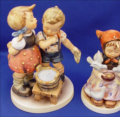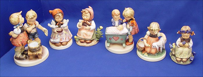 LOT OF HUMMEL FIGURINES: To include, ''Bath Time'', incised 412, Trademark 6, approx. 6''h.; ''Cinderella'', incised 337, Trademark 6, approx. 4 1/4''h.; ''Make a Wish'', incised 475, Trademark 6, approx. 4 1/2''h.; ''Blessed Event'', incised 333, Trademark 6, approx. 5 1/4''h.; ''Favorite Pet'', incised 361, Trademark 6, approx. 4 1/4''h.; ''The Botanist'', incised 351, Trademark 6, approx. 4 1/2''h. Six Hummel figurines, sold as a lot.