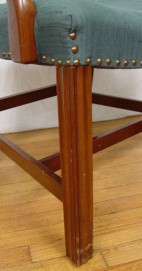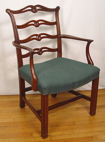 SET OF 6 MAHOGANY CHIPPENDALE DINING CHAIRS: From the same home as the Kittinger table at lot 41. A substantial set of ribbon back dining chairs, 2 have arms, 4 are side chairs. 39''h., the seats are 18'' from the floor, 22''w. Please call for condition.