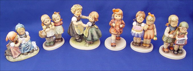 LOT OF HUMMEL FIGURINES: To include, ''Easter Time'', incised 384, Trademark 6, approx. 4''h.; ''Daddy's Girls'', incised 371, Trademark 6, approx. 4 1/2''h.; ''Spring Dance'', incised 353/0, Trademark 6, approx. 5 1/2''h.; ''The Kindergartner'', incised 467, Trademark 6, approx. 5 1/4''h.; ''Happy Birthday'', incised 176, Trademark 6, approx. 5''h.; ''Close Harmony'', incised 336, Trademark 6, approx. 5 1/4''h. Six Hummel figurines, sold as a lot.