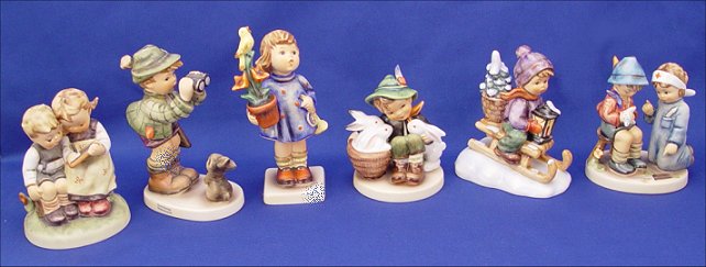 LOT OF HUMMEL FIGURINES: To include, ''The Smart Little Sister'', incised 346, Trademark 6, approx. 4 1/4''h.; ''Good Hunting!'', incised 307, Trademark 6, approx. 5''h.; ''Congratulations'', incised 17/0, Trademark 6, approx. 5 3/4''h.; ''Playmates'', incised 58/0, Trademark 6, approx. 4''h.; ''Ride into Christmas'', incised 396 2/0, Trademark 6, approx. 4 1/4''h.; ''Little Nurse'', incised 376, Trademark 6, approx. 4''h. Six Hummel figurines, sold as a lot.