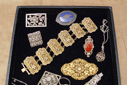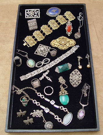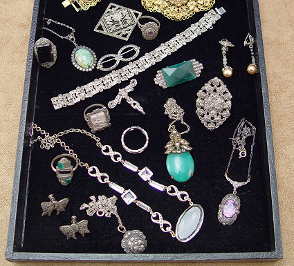 TRAY LOT OF ESTATE MARCASITE JEWELRY: To include gold tone bracelet and pin; silver and sterling pins, rings, earrings and pendants; crystal and marcasite necklace. Sold as a lot.