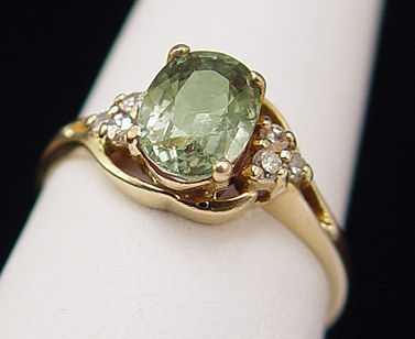NATURAL 1.66ct GREEN ALEXANDRITE RING: Oval cut stone, approx. 1.66ct, in lovely green tones of the spectrum, only very slight color change on this one. Set in 14k yellow gold mount with diamond accents. Size 7.5, 2.5 grams.