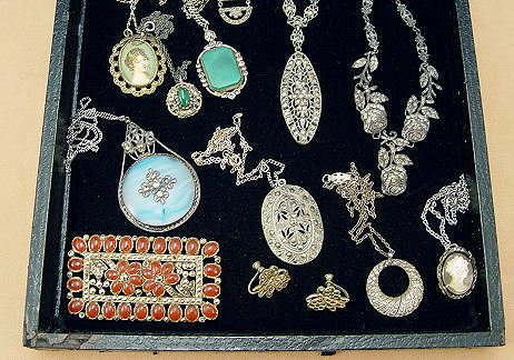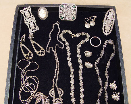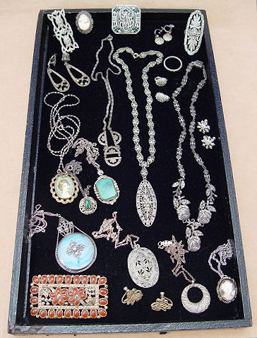 TRAY LOT OF ESTATE MARCASITE JEWELRY: To include, necklaces both pendant and lavalier styles, rings and earrings. Many marked sterling. Sold as a lot.