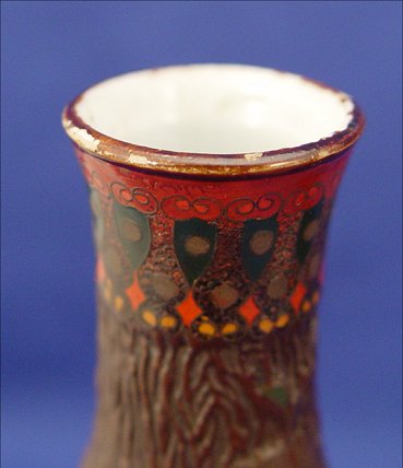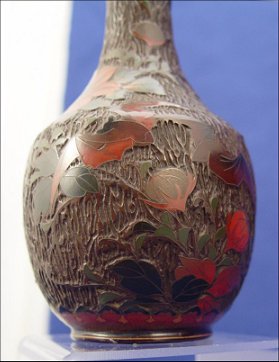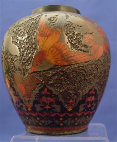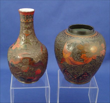 2 JAPANESE TREE BARK TOTAI CLOISONNE VASES: The jar shaped vase is decorated in birds and flowers, 4 1/2''. The taller vase is and needle neck, 6''h.