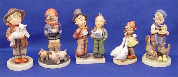 LOT OF 5 FULL BEE HUMMEL FIGURINES: To include, ''Lost Sheep'', incised 68, Trademark 2, approx. 6''h.; ''Farm Boy'', incised 66, Trademark 2, approx. 5 1/2''h.; ''Duet'', incised 130, Trademark 2, approx. 5 1/4''h.; ''Goose Girl'', incised 47 3/0, Trademark 2, approx. 4''h.; ''Feeding Time'', incised 199, Trademark 2, approx. 5 1/2''h. Five Hummel figurines, sold as a lot.