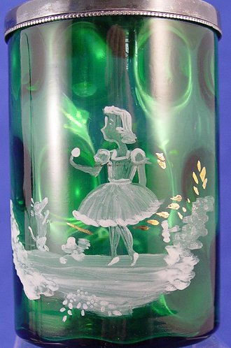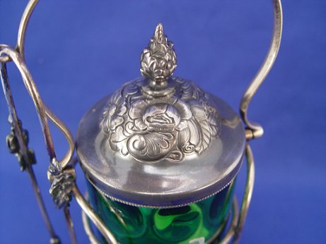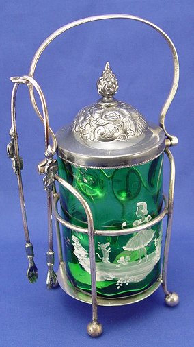VICTORIAN SILVERPLATE PICKLE CASTOR: Emerald green coin spot Mary Gregory glass jar in a stand marked HFS EPNS. Tongs included. Jar is 3'' dia. stand is 9 1/2'' overall.