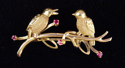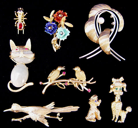 ESTATE LOT OF FIGURAL PINS AND FOLIATE BROOCHES: To include, 14k white and yellow gold swirling leaves set with 5mm pearl and 3 tiny diamonds, marked 585 CG, 6.7 grams; 18k yellow gold with enameled flowers centered by tiny diamonds, marked K in dotted circle 18K Italy, 6.8 grams; 18k yellow gold branch with ruby? buds and two birds, marked 750 Italy, 4.7 grams; 14k yellow gold road runner on the move, ruby? eye, marked PJ 14k, 6.6 grams; 18k yellow gold bug pin, adorable ant with ruby body and sapphire eyes, marked 750 and illegible makers mark on double prong pin back, 2.4 grams; 14k yellow gold poodle pin, blue stone eyes, unmarked, 5.5 grams; 14k yellow gold poodle pin, green stone eyes, marked GW 14K, 5.3 grams; 14k yellow gold cat pin with jade? cabochon head and body, red stone eyes, marked 14k SYL, 8.3 grams. Eight pins sold as a lot.