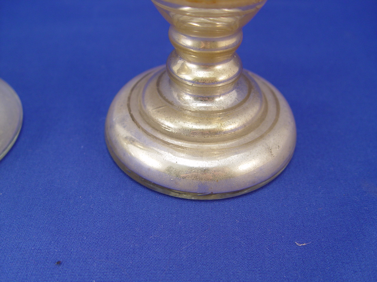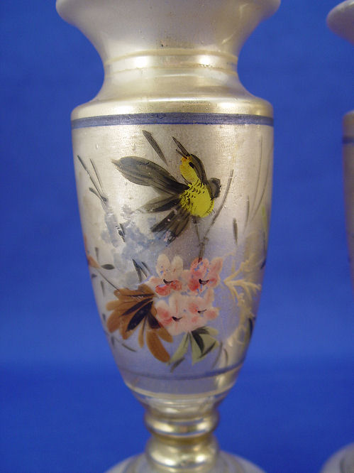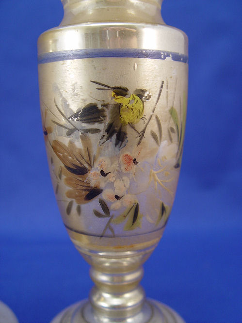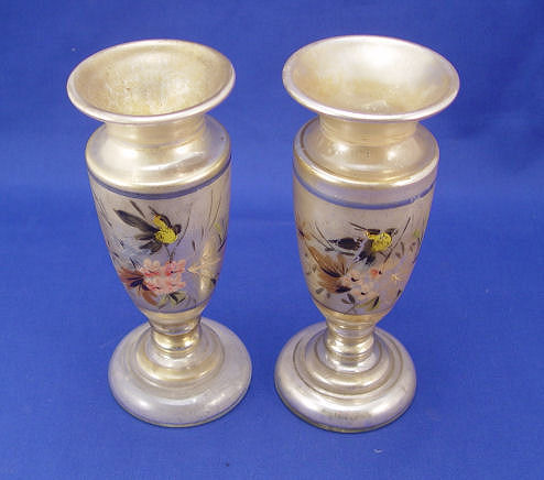 PAIR OF VICTORIAN MERCURY GLASS VASES: Hand painted bird decor, 7 1/2''h. Please call for condition.