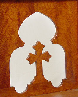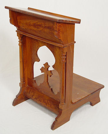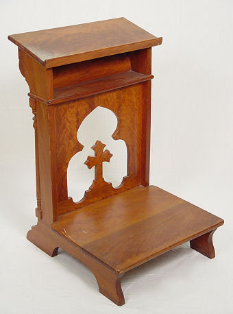 CROTCH GRAIN MAHOGANY PREI DIEU KNEELER: Wonderful highly figured grain, ornate cross carved into the frame, solid wood construction, 33''h., 22''w., approx. 23''d. overall.