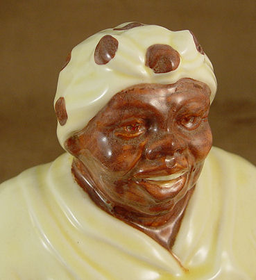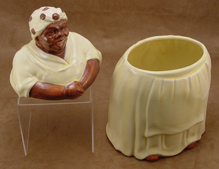 VINTAGE MAMMY COOKIE JAR: Dressed in pale yellow dress and bandana. Free of chips, cracks, or repairs, fresh from an estate. No makers marks. Approx. 12 1/4'' h. 8'' wide at the base.