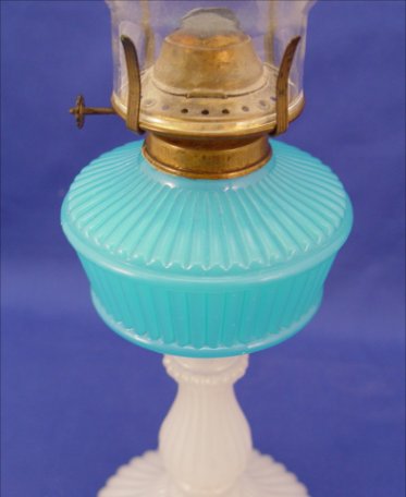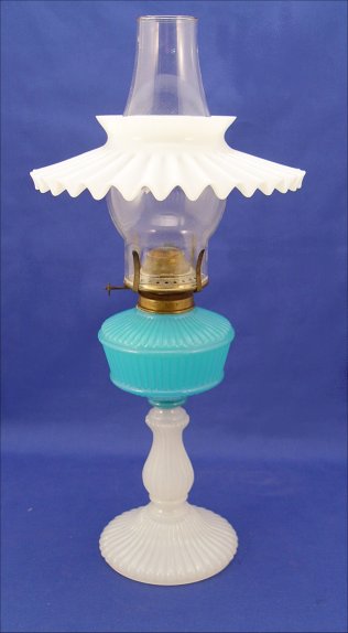 EARLY BLUE AND WHITE GLASS OIL LAMP: Possibly Eaton. Composite of opaque blue font and opaque or alabaster white glass stem and base. Lamp portion is 9''h. Chimney and opaque ruffled glass shade are included. 17'' overall.