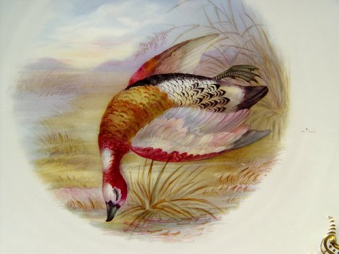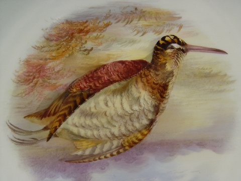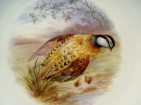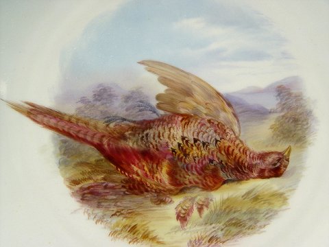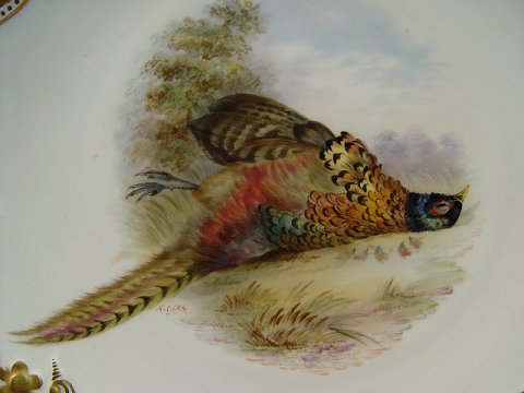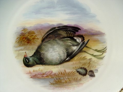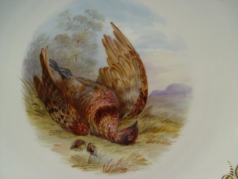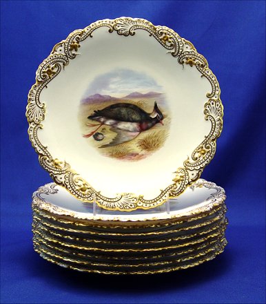 9 COPELAND ENGLISH PORCELAIN GAME PLATES: Each centering a different hand painted game bird. Embossed and gilt border. The backs are marked Copelands China England. 9'' dia.