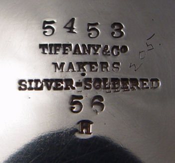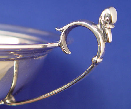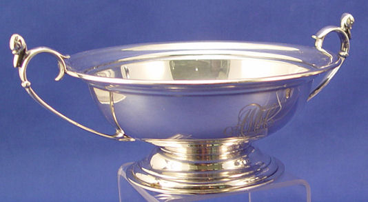 TIFFANY & CO SILVER SOLDERED HANDLED BOWL, Circa 1895: Pedestal bowl with double handles topped by duck heads, monogrammed AMH in script, marked 5453 Tiffany & Co Makers Silver-Soldered 56 H, overall 7 3/4''w., 3 1/4''h.