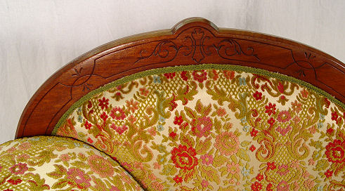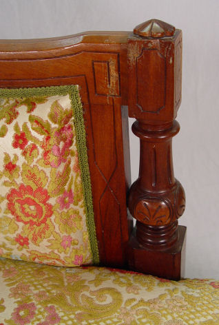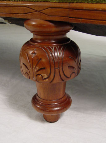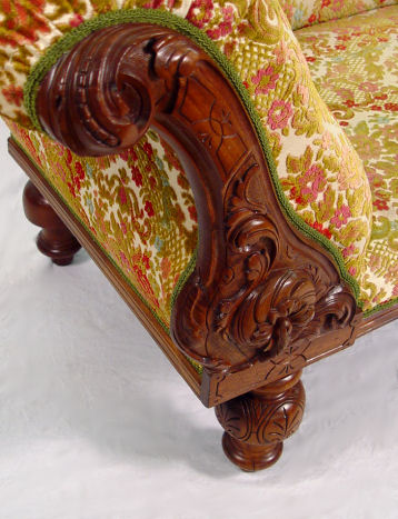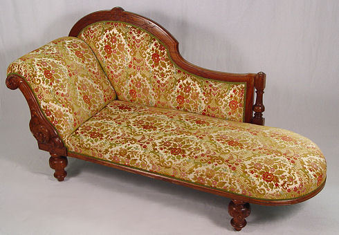 CARVED VICTORIAN WALNUT CHAISE LOUNGE: Renaissance revival incised and carved frame, 77'' l. x 21'', backboard is 38 3/4'' high. Later cut velvet upholstery.