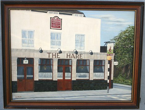 POUNDS, Greta, (English,20th C): ''The Hare'', O/C, 30'' x 40'', signed lower left, encased in wooden frame, 35 1/2'' x 45 1/2''. This is a famous English pub.
