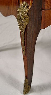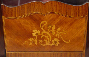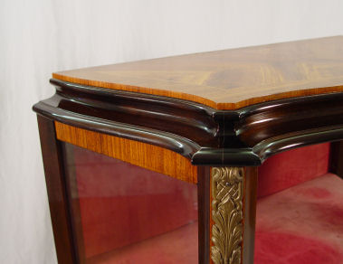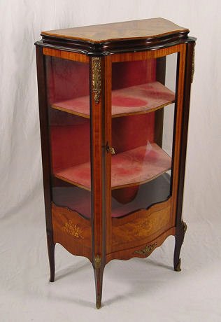 MARQUETRY AND STRING INLAY VITRINE: Serpentine glass front, string inlay lines the edges of the shelves as well as the canted edges of the exterior. Ormolu mounts. 48''h. x 27'' x14''.