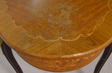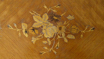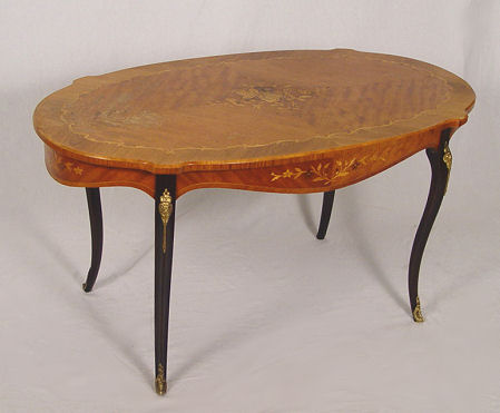 FRENCH MARQUETRY INLAY PARLOR TABLE: Ormolu mounted satin wood coffee table, 22 3/4''h. x 44 1/2'' x 23 1/2''. Please call for condition.