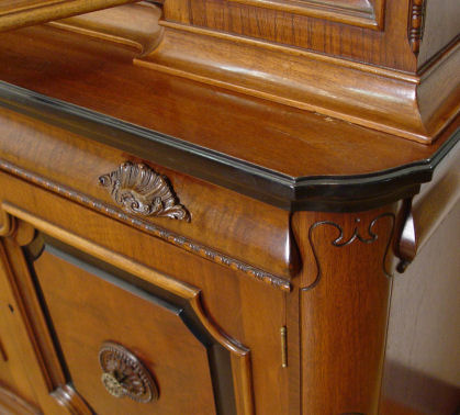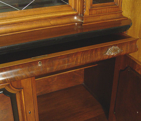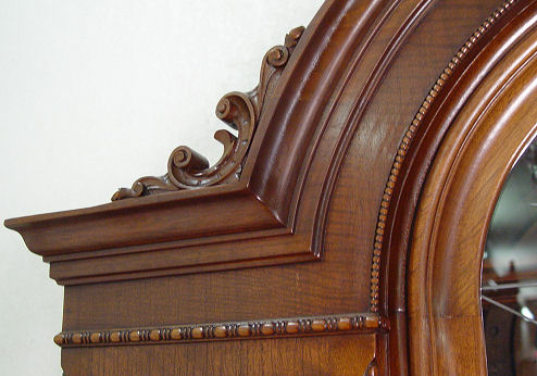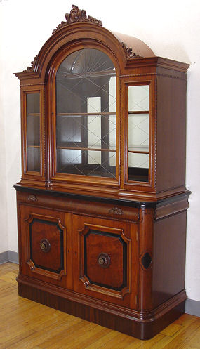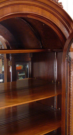 FINE MAHOGANY CHINA CABINET BY MECHANICS FURNITURE OF ROCKFORD: Fine detail from the arched top carved crest and etched glass door to the curved stiles with incised carving. Top interior shelf is recessed for tall items. Rockford, Illinois. 77 1/2'' h x 46'' x 19 1/2'' d.