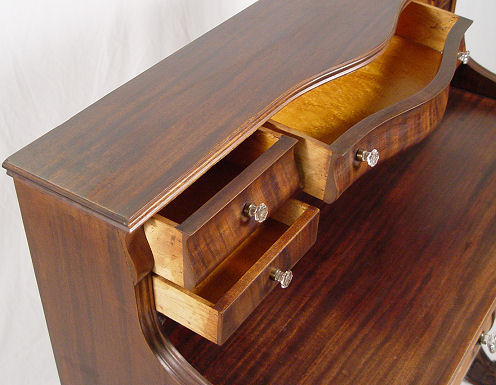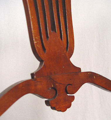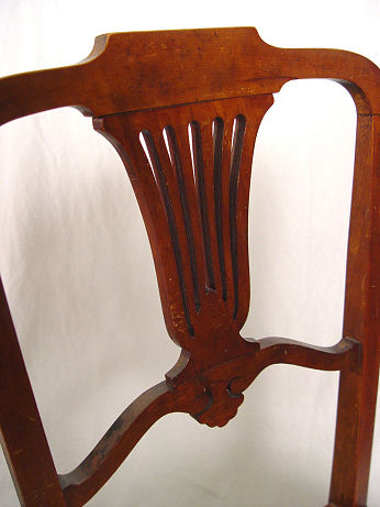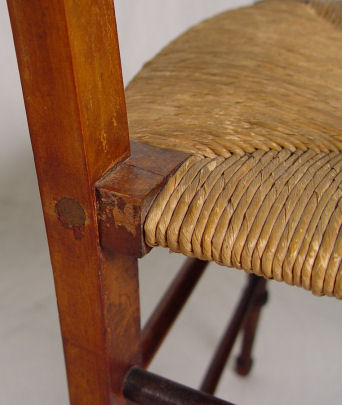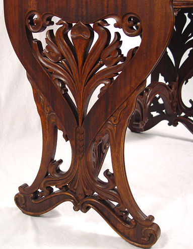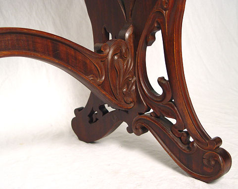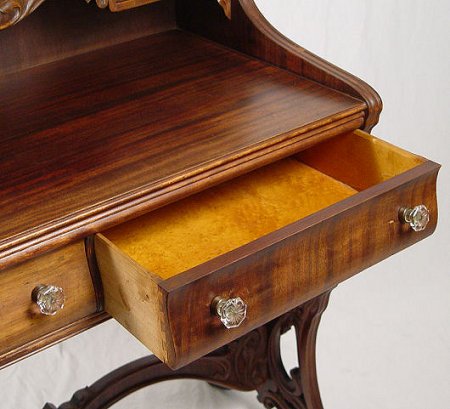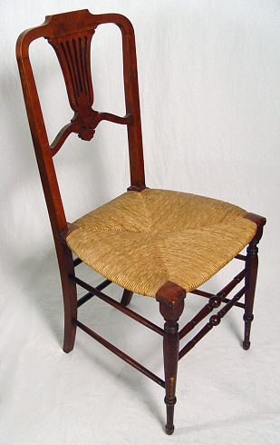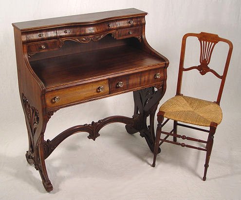 VICTORIAN LADIES DESK AND CHAIR: The sides and legs are one ornately carved board. A series of drawers comprise the upper section, two half length drawers at the writing level. Glass knobs throughout. The chair has petite turnings on legs, pierced back and rush seat. Desk is 41''h. x 36'' x18''. Please call for condition.