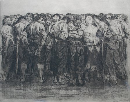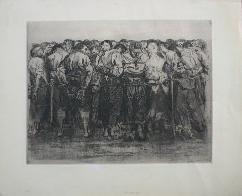 KOLLWITZ, Kathe, (German, 1867-1945): ''Die Gefangenen'' (The Prisoners), Etching, impression size 12 3/4'' x 16 1/2'', full margins, unsigned, AVD Becke Muenchen-22 blind stamp lower right, unframed.