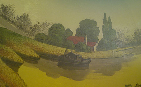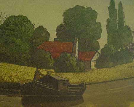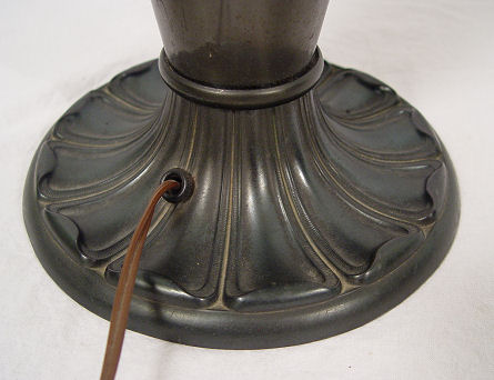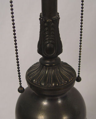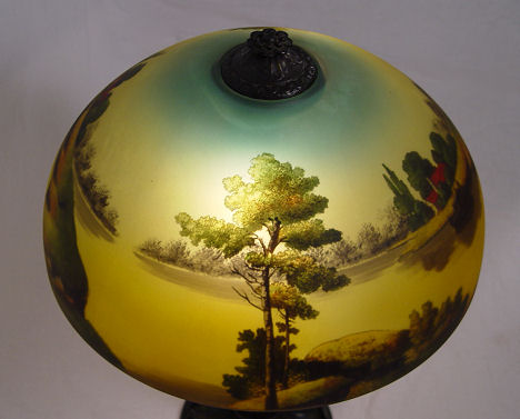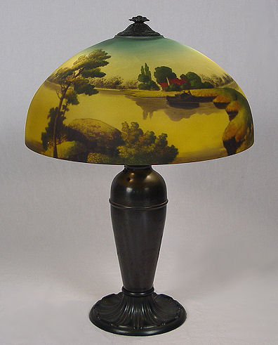 CA 1920s PHOENIX REVERSE PAINTED LAMP: Landscape scene on glass dome shade, bronzed base. Pull chain double sockets. Unsigned. 25''h, the shade is 18'' dia.