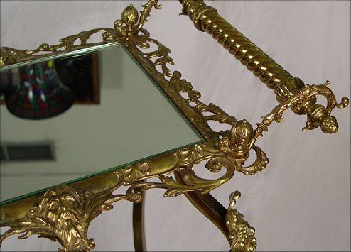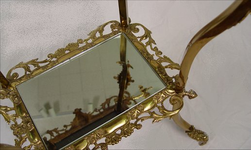 ORNATE GILT BRASS CALLING CARD STAND: Scrolled sides, masqueron ornamentation, two mirrored glass tiers, 33''h. x 22'' x13''. Slightly loose and off kilter.