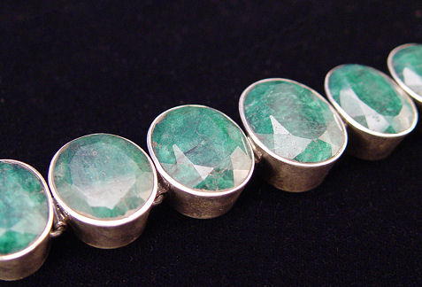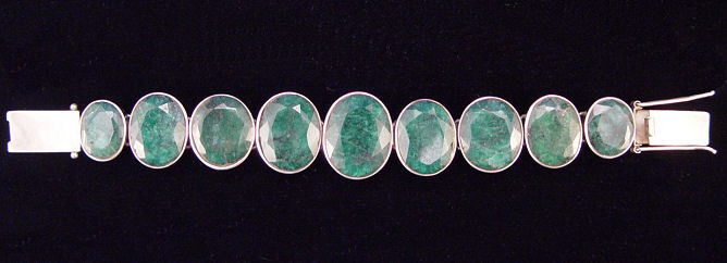 IMPRESSIVE 108 CTW EMERALD BRACELET: Nine oval cut emeralds ranging in size from 5.5ct to 18.5ct, all bezel set in deep sterling mounts, pressure clasp with double safety clips, approx. 7 1/4''l., 71.7 grams. Sold with current insurance appraisal stating Retail Replacement cost of $2,900.00. Est. $1000/1500**