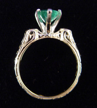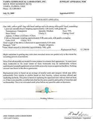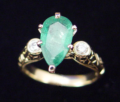 1.80CT EMERALD & DIAMOND RING: Pear cut emerald of approx. 1.80ct prong set upon a 14k yellow gold mount overall etched in a foliate motif, accented by two bezel set diamonds of approx. .16pts total, size 7, approx. 4.8 grams. Sold with current insurance appraisal stating Retail Replacement cost of $1,580.00.