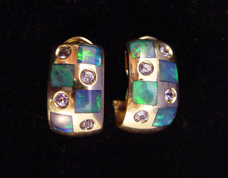 BLACK OPAL, TANZANITE AND 14K GOLD HUGGIE EARRINGS: Lovely flash and fire, yellow gold inset with blocks of black opal and round brilliant cut tanzanites, French omega post backs, marked 14k MW, 10.7 grams.