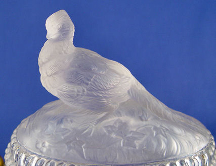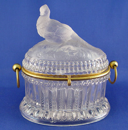 VICTORIAN FRENCH CRYSTAL GLASS JEWEL CASKET: Surmounted by a pheasant, hinged lid, brass mounts with ring handles. 7 1/2''h. x 7''.