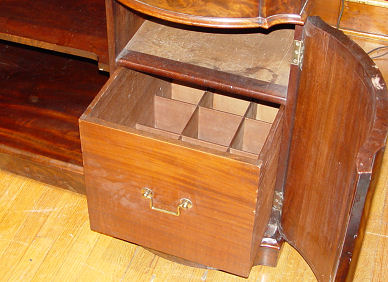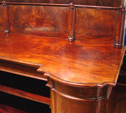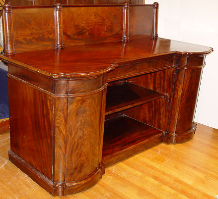 19TH C MAHOGANY PEDESTAL SIDEBOARD: Central counter with open shelving. Swell front pedestals, one with wine drawer. 77 1/4'' l. x 31 1/2'' w. x 37'' h., overall with backsplash is 52''h.