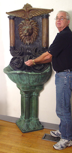 ITALIAN ROCOCO LION WALL FOUNTAIN: 6' 4'' ft. tall wall fountain featuring a majestic lion that spews water into the shell form receiver. Patinated bronze?. 28''w. x 20'' deep. Est. $900/1200**