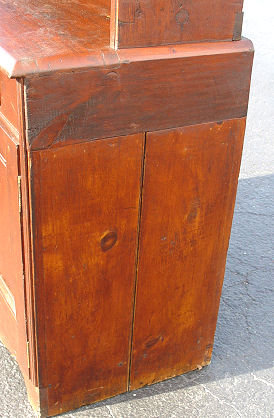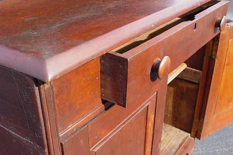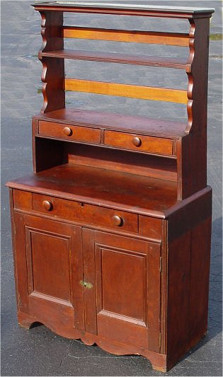19th C AMERICAN COUNTRY STEPBACK HUTCH: Upper open back shelving over drawers, over two more drawers and cabinet base. 69 1/2''h. x 38''w. x 20''.