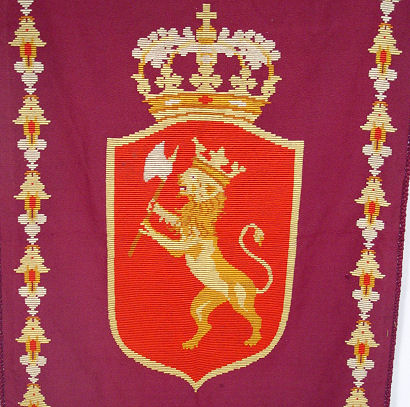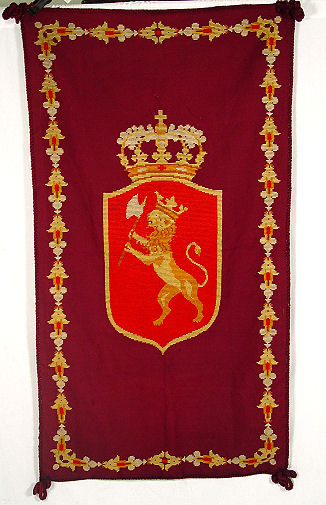 HERALDIC LION NEEDLEPOINT COAT OF ARMS: Needlepoint on fabric, silk backing. 64'' x 36''