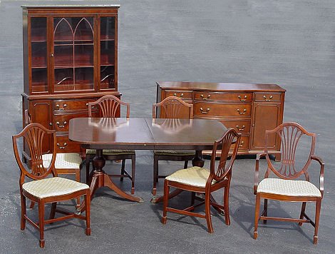 9 PIECE DUNCAN PHYFE STYLE MAHOGANY DINING SUITE: To include Duncan Phyfe TABLE 62'' x 40'', with smoke glass topper, 6 shield back CHAIRS with one having arms, a SIDEBOARD 62''l, and CHINA CABINET.