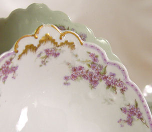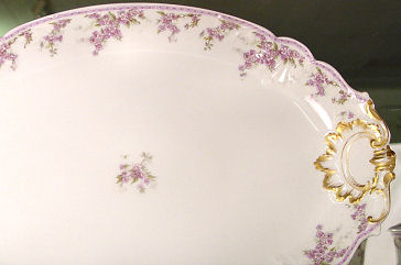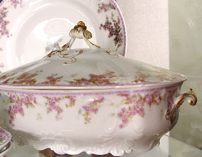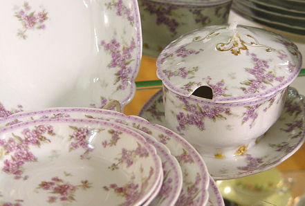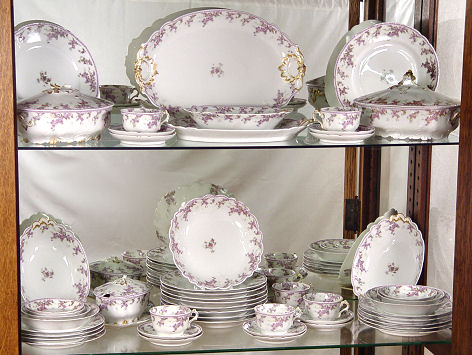 FRENCH LIMOGES CHINA SERVICE: 54 pieces with plenty for serving, to include 2 platters, round serving bowl, 3 oval vegetable bowls, 2 covered vegetable (1 with cover damage), gravy ( cover damage), 10 dinner plates (9 3/4''), 9 luncheon plates (8 1/4''), 6 cups and saucers, 5 extra saucers, 3 dessert bowls, 2 soup bowls, and 2 cereal bowls. Please expect a few small chips. Gerard, Dufraisseix, and Abbot.