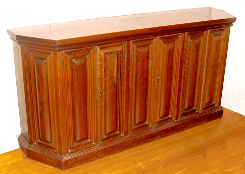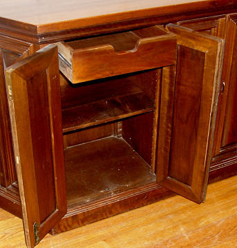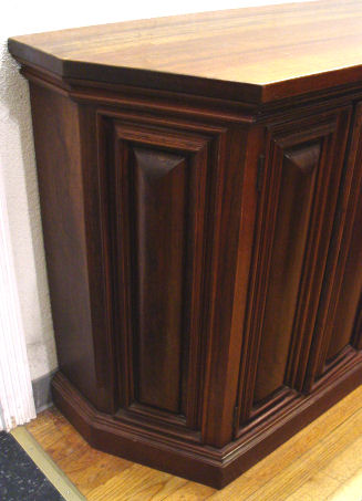 SOLID WALNUT CREDENZA: Carved panel doors, adjustable interior shelves. 35''h. x 73''l. x 18''.